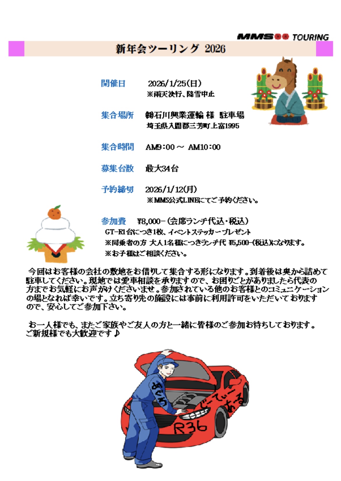 参加予約はMMS公式LINEで受け付けしております。お名前、参加車型式(BNR32/BCNR33/BNR34等)、参加人数をお知らせください。