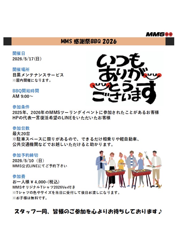 5月のマンスリーイベントは、2025年、2026年のツーリングイベントにご参加いただいたお客様限定でMMS感謝祭BBQを開催します。駐車場に限りがありますので、相乗りなどご配慮いただけると助かります。先着順となりますので、ご希望のお客様はお早目に公式LINEよりご連絡いただければと思います。皆様のご参加、お待ちしております。